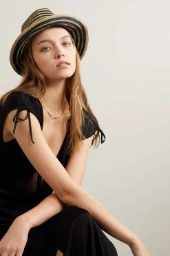 Le chapeau Juliette d’Eres, qui sera idéal pour vos prochaines vacances sous les tropiques, est habillé de rayures noires et beiges audacieuses et faciles à marier. Il est réalisé en Italie à partir de pailles en papier, doté d’une couronne sculptée et présente un bord repliable, qui vous protégera des rayons du soleil sans pour autant dissimuler votre visage.