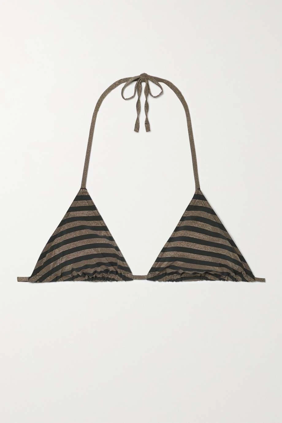 Le haut de bikini rayé Backgammon d’Eres est réalisé en Lurex stretch noir et doré scintillant qui reflétera joliment la lumière du soleil lorsque vous vous détendrez au bord de la piscine. Particulièrement flatteur pour les petites poitrines, il présente des bonnets triangulaires ainsi que de délicates bretelles à nouer. Complétez l’ensemble avec la culotte assortie.