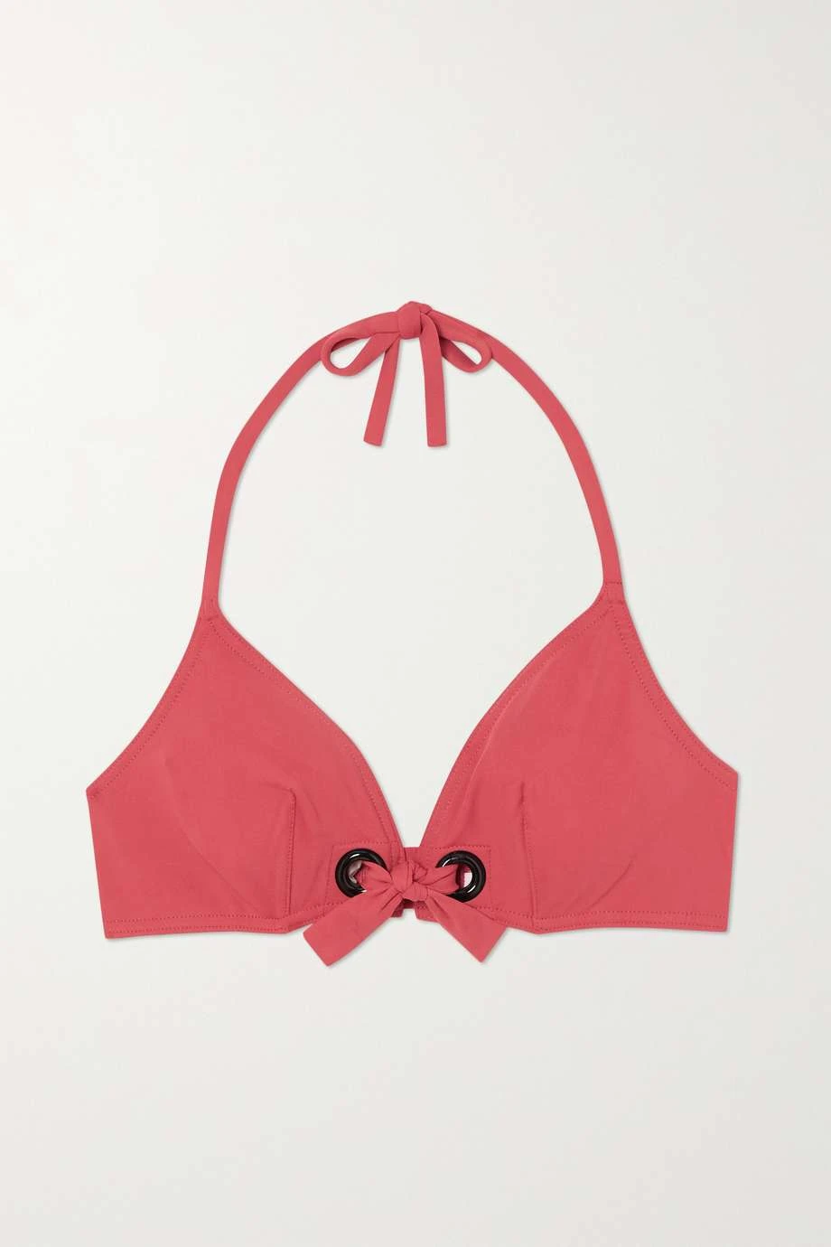 La collection Naïades d’Eres se compose de pièces confortables et élégantes qui se parent toutes d’œillets métalliques, un détail emprunté aux vestes sahariennes classiques. Ce haut de bikini triangle est réalisé en France à partir de l’étoffe Peau douce signature du label, et possède des liens noués sur le devant ainsi qu’un dos emboîtant. Portez-le avec la culotte coordonnée Divinité.