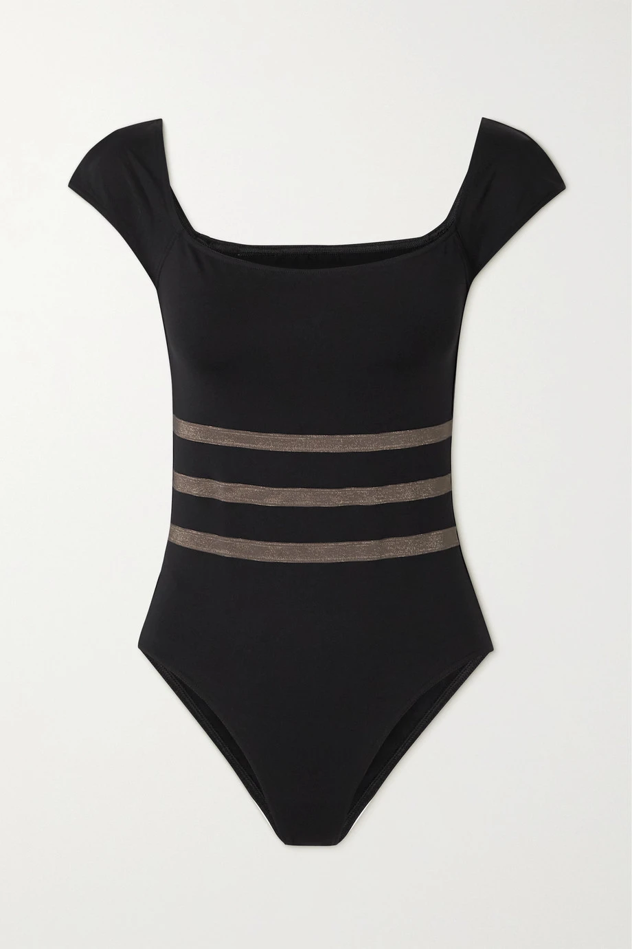 Collection après collection, Eres s’attache à proposer des créations confortables conçues pour vous donner confiance en vous. Le maillot de bain Mariniere, par exemple, est pourvu d’une élégante encolure carrée ainsi que de jolis mancherons, afin de mettre votre décolleté en lumière tout en étant plus couvrant que les modèles classiques. Il est réalisé en tissu stretch à séchage rapide et souligné de rayures en Lurex doré à la taille. Portez-le comme un body pour aller dîner ou prendre un cocktail en bord de plage.