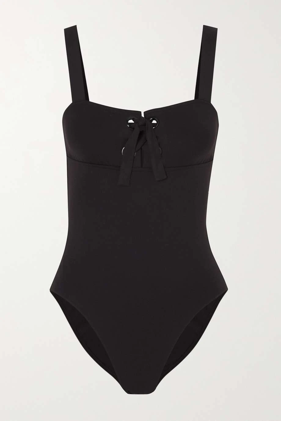 La collection Naïades d’Eres est reconnaissable grâce à ses œillets oversize signature, inspirés des belles vestes sahariennes. Le maillot de bain Lilee est réalisé à partir de l’emblématique tissu Peau Douce de la marque et présente un devant à lacets.