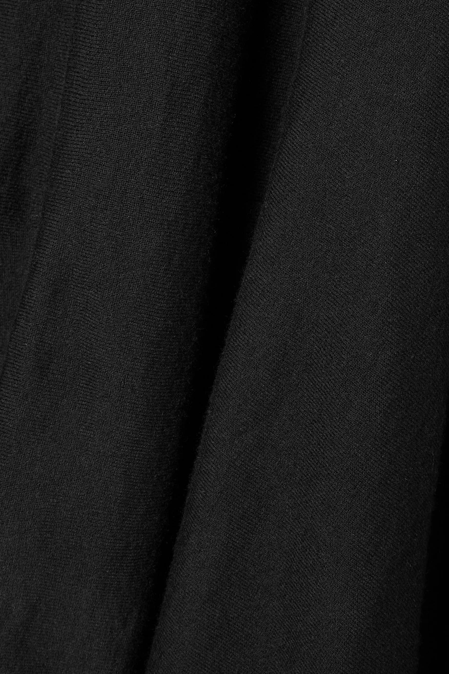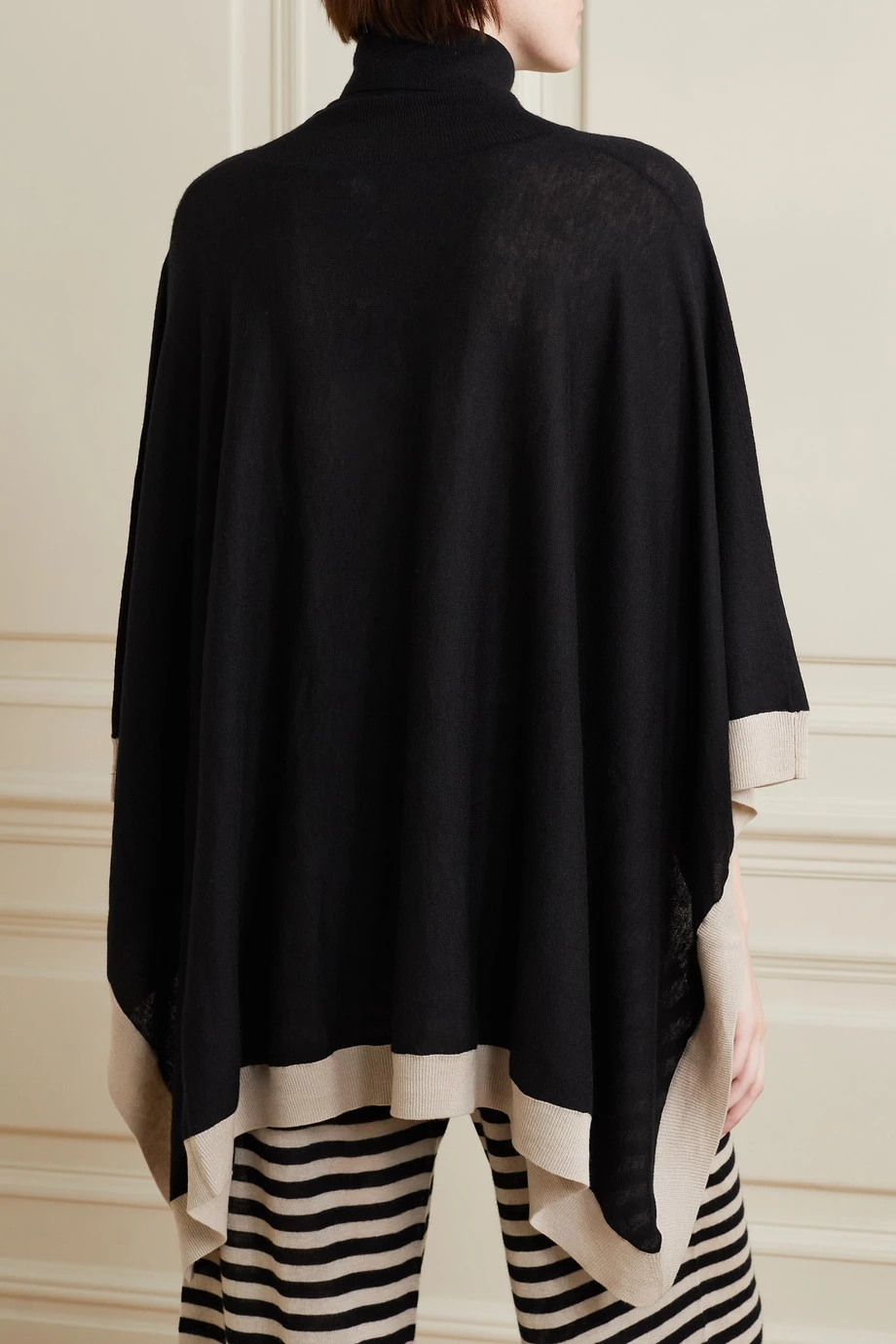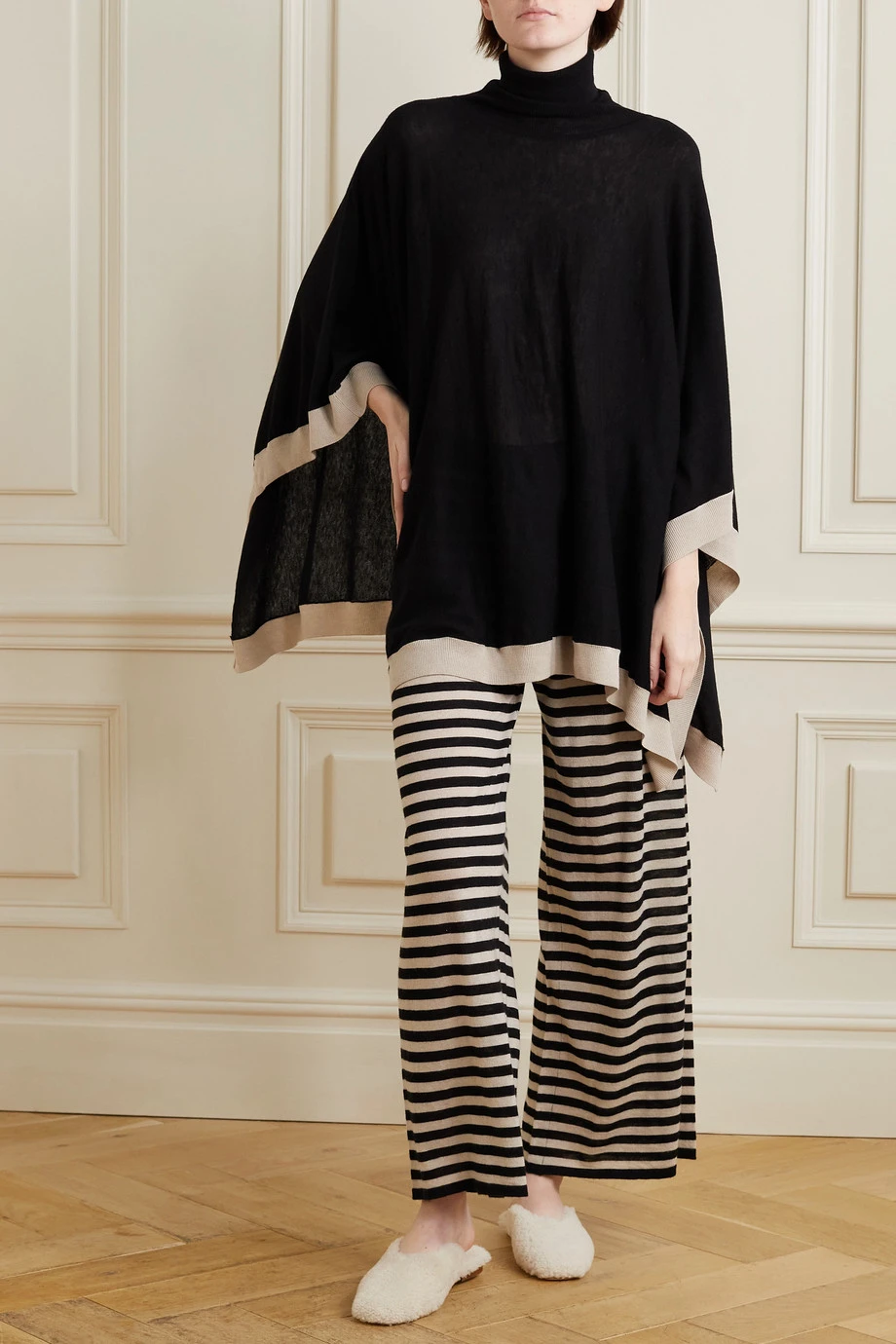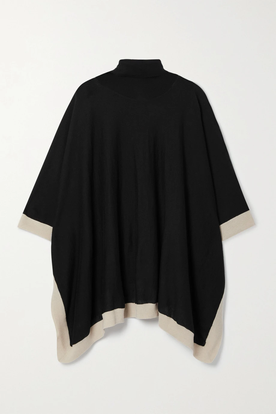 Le poncho Marin d’Eres est réalisé en cachemire noir, avec lequel contraste joliment la large bande côtelée blanc cassé qui borde son ourlet asymétrique fluide. Il adopte une coupe ample enveloppante, surmontée par un col roulé douillet. Enfilez le vôtre avec le pantalon de survêtement Optimiste de la marque ou avec un jean.