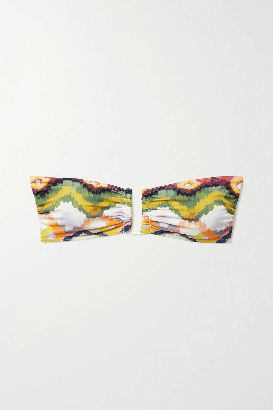 Ce haut de bikini signé Eres est paré d’un imprimé coloré évoquant les ailes délicates d’un papillon, un motif inspiré de la technique de teinture traditionnelle ikat. Il est confectionné en tissu stretch sculptant et adopte une silhouette bandeau, structurée par des baleines sur les côtés ainsi que par une finition centrale en forme de U. Associez le vôtre à la culotte Pulpe coordonnée.