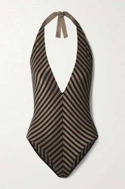 Le maillot de bain Fair Play, issu de la collection Backgammon d’Eres, est réalisé en Lurex stretch noir parsemé de rayures dorées et doté d’un décolleté très plongeant ainsi que d’un dos échancré. Vous pourrez régler ses liens à la nuque pour un ajustement parfait.